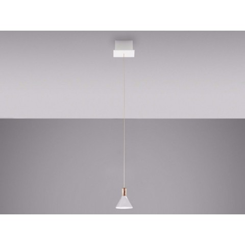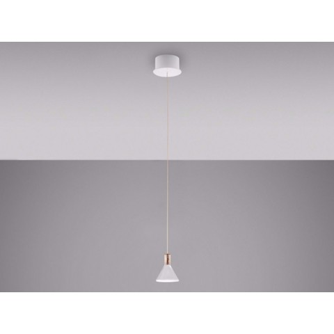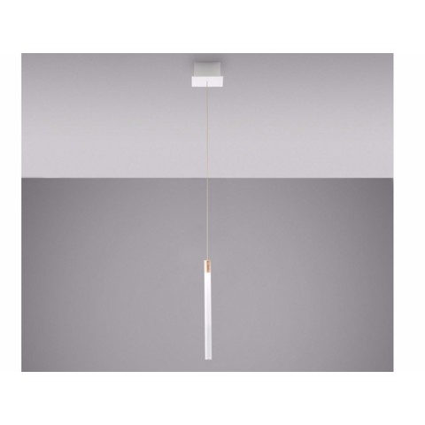 Lampada a sospensione con diffusore in vetro borosilicato trasparente con cilindro interno in materiale plastico. Montatura in alluminio e rosone in metallo verniciato bianco.