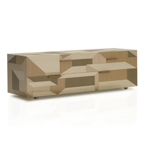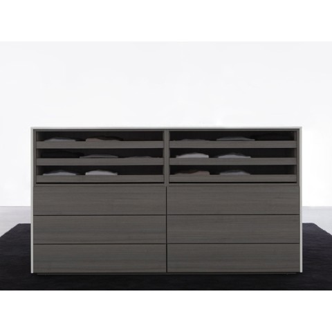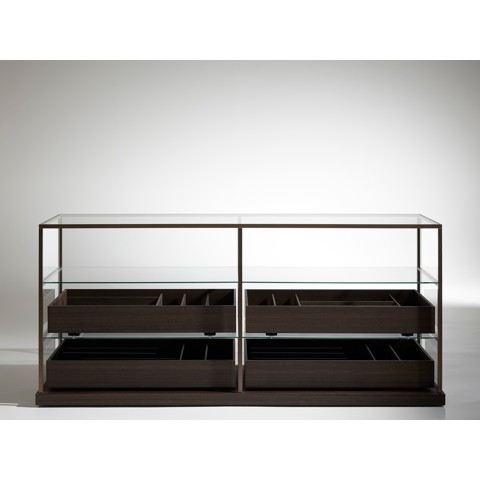 Combinando 2 profondità, 2 altezze cassetto e 2 lunghezze, il progetto si declina in una ricca gamma di tipologie che include comodino, comodino lungo e cassettiera ad isola, in molteplici variazioni. Ogni modulo infatti è liberamente attrezzabile scegliendo la propria sequenza preferita tra cassetti in legno, cassetti in vetro trasparenti o colorati monofacciali o bifacciali, teche espositive in vetro h.10 o 20 cm, scaffali con vassoi in pelle, fino ad una comoda panca rivestita in cuoio con cassettone, pensata per l’attesa durante la prova d’abito.